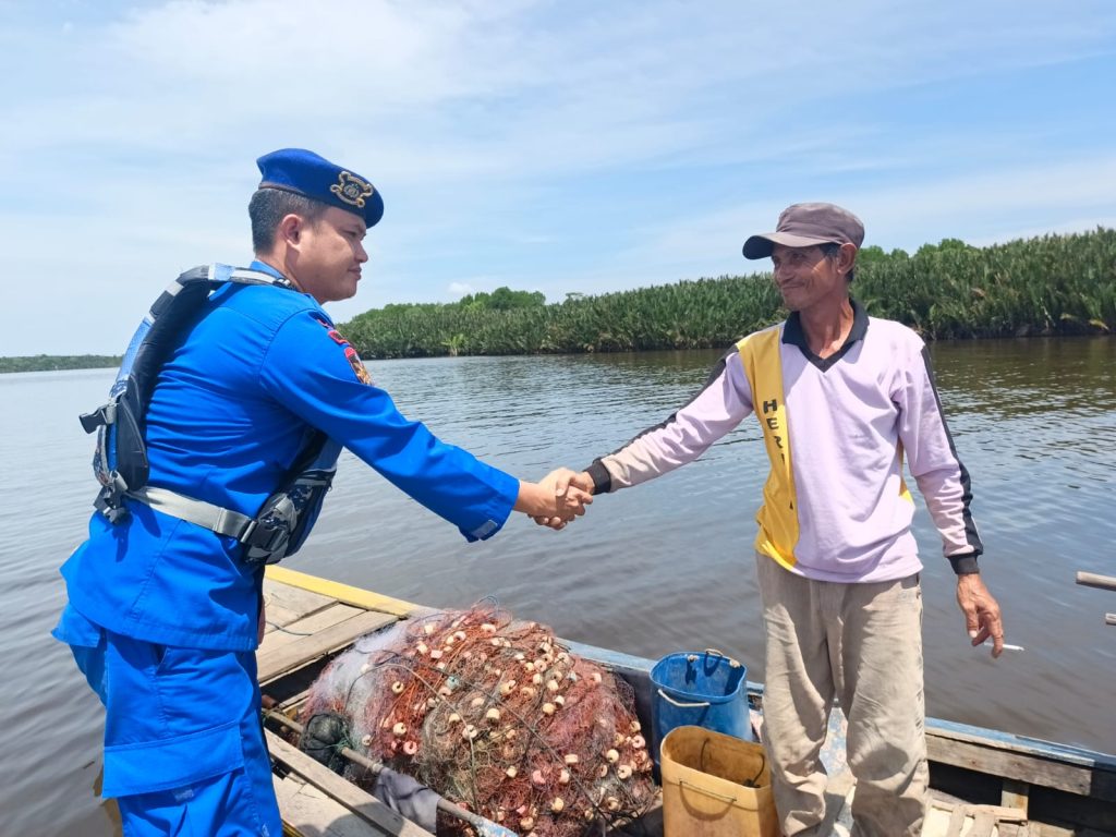 ANGGOTA KP. BIDARA VI-2002 MUARA KUBU MEMBERIKAN HIMBAUAN KAMTIBMAS PERAIRAN KEPADA NELAYAN YANG SEDANG BERAKTIVITAS DI PERAIRAN MUARA KUBU