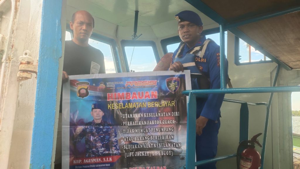 Anggota KP.VI-10-16 Kendawangan memberikan himbauan keselamatan berlayar kepada Crew kapal diperairan Kendawangan