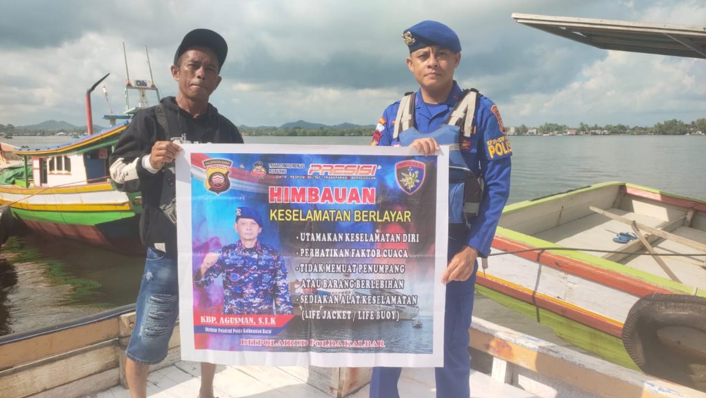 Anggota KP.VI-10-16 Kendawangan memberikan himbauan keselamatan berlayar kepada Masyarakat Pengguna Jasa Transportasi Motor Air diperairan Kendawangan,