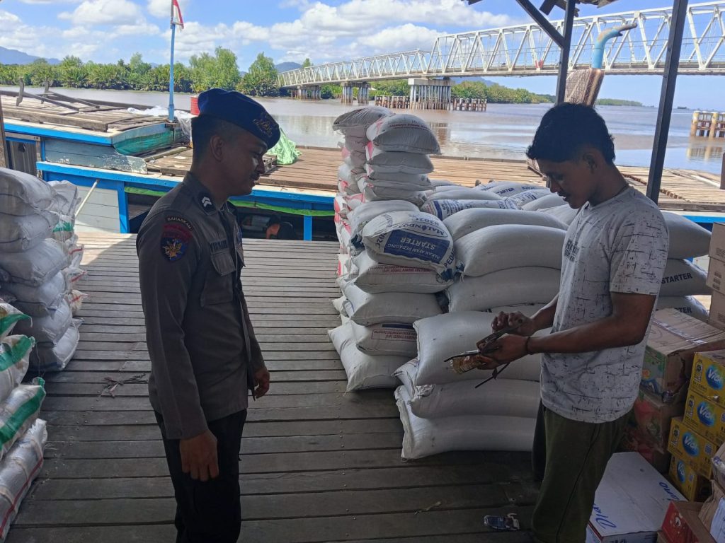 Anggota KP.VI-1010 memberikan himbauan keselamatan kepada tkbm yang sedang bongkar muat barang dipelabuhan pasar rakyat teluk melano agar tetap menjaga keselamatan serta selalu mejaga kamtibmas