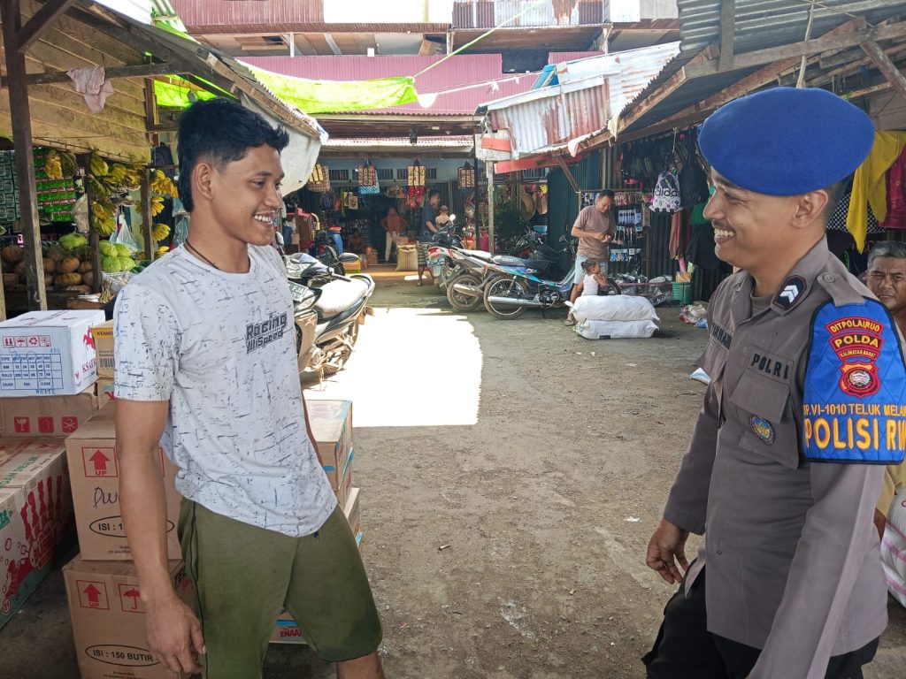 Anggota KP.VI-1010 memberikan himbauan keselamatan kepada tkbm yang sedang bongkar muat barang dipelabuhan pasar rakyat teluk melano agar tetap menjaga keselamatan serta selalu mejaga kamtibmas
