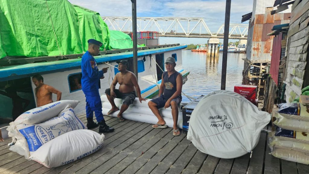 Anggota KP.VI-1010 memberikan himbauan keselamatan kepada tkbm yang sedang bongkar muat barang dipelabuhan pasar rakyat teluk melano agar tetap menjaga keselamatan serta selalu mejaga kamtibmas