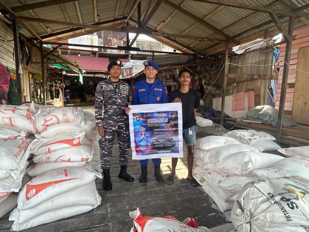 Anggota KP.VI-1010 memberikan himbauan keselamatan kepada tkbm yang sedang bongkar muat barang dipelabuhan pasar rakyat teluk melano agar tetap menjaga keselamatan serta selalu mejaga kamtibmas