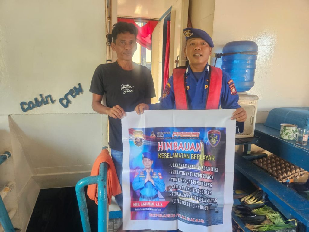 Anggota KP.VI-1010 memberikan himbauan keselamatan berlayar kepada crew kapal yang sedang melintasi alur pelayaran teluk melano agar tetap menjaga keselamatan serta selalu mejaga kamtibmas