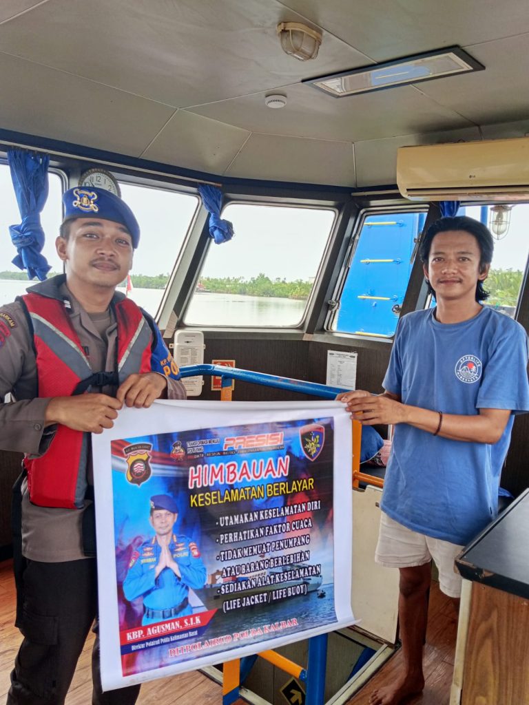 Anggota KP.VI-1010 memberikan himbauan keselamatan berlayar kepada Nahkoda kapal yang sedang melintasi alur pelayaran teluk melano agar tetap menjaga keselamatan serta selalu mejaga kamtibmas