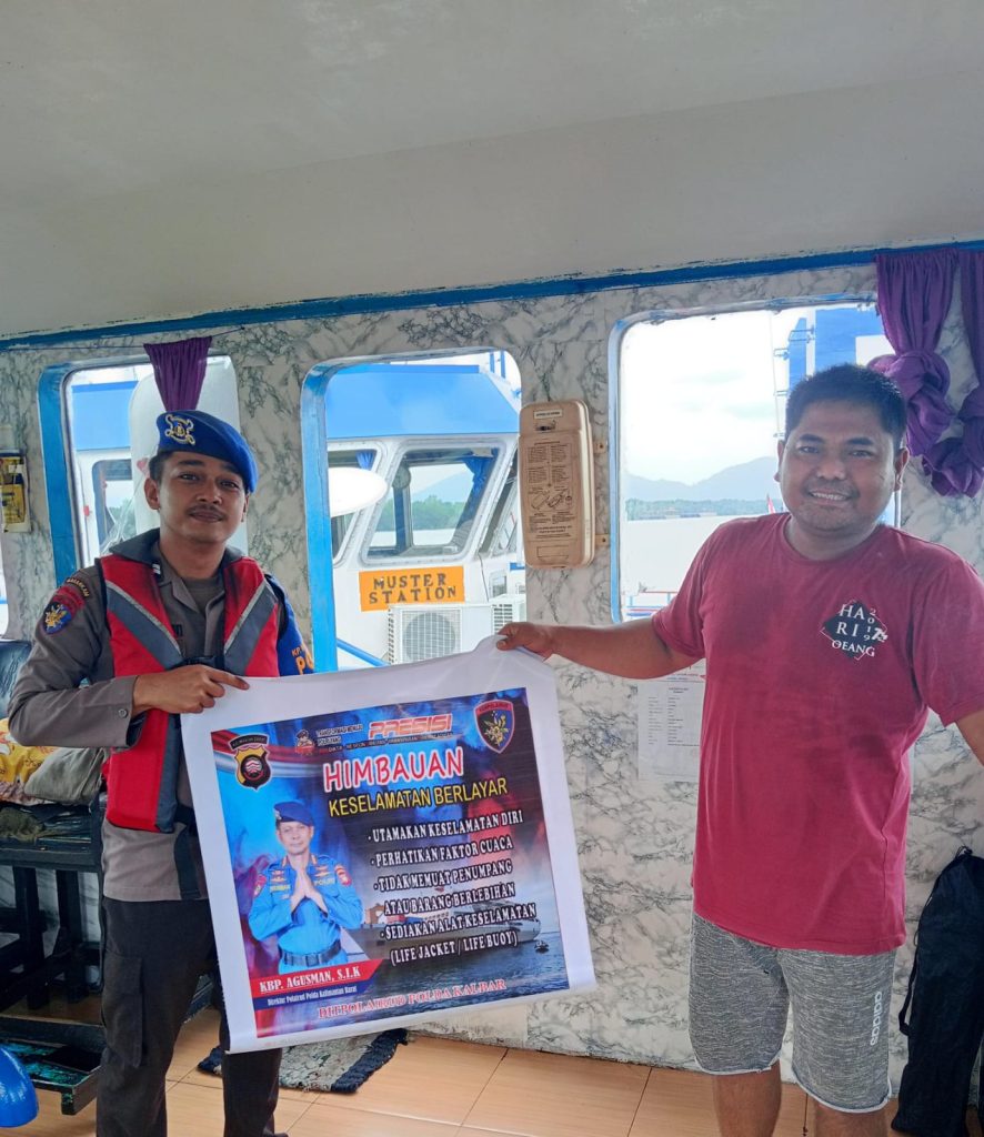 Anggota KP.VI-1010 memberikan himbauan keselamatan berlayar kepada Nahkoda kapal yang sedang melintasi alur pelayaran teluk melano agar tetap menjaga keselamatan serta selalu mejaga kamtibmas