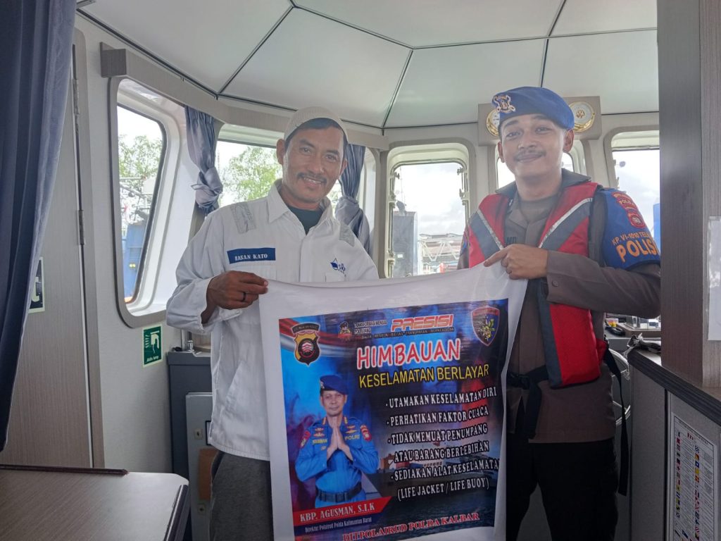 Anggota KP.VI-1010 memberikan himbauan keselamatan berlayar kepada Nahkoda kapal yang sedang melintasi alur pelayaran teluk melano agar tetap menjaga keselamatan serta selalu mejaga kamtibmas