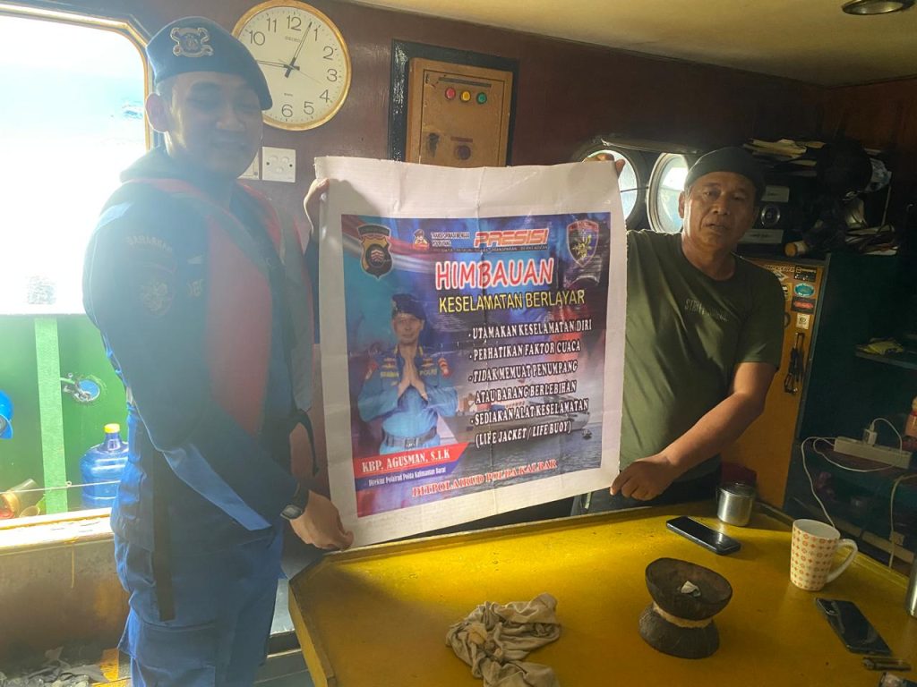 Anggota KP.VI-1010 memberikan himbauan keselamatan berlayar kepada ABK Kapal yang sedang melintasi alur pelayaran teluk melano agar tetap menjaga keselamatan serta selalu menjaga kamtibmas