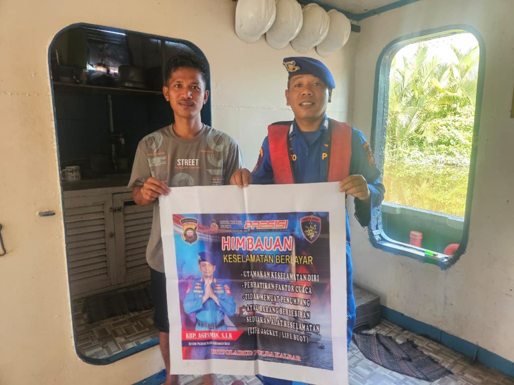 Anggota KP.VI-1010 memberikan himbauan keselamatan berlayar kepada Nahkoda Kapal yang sedang melintasi alur pelayaran teluk melano agar tetap menjaga keselamatan serta selalu mejaga kamtibmas