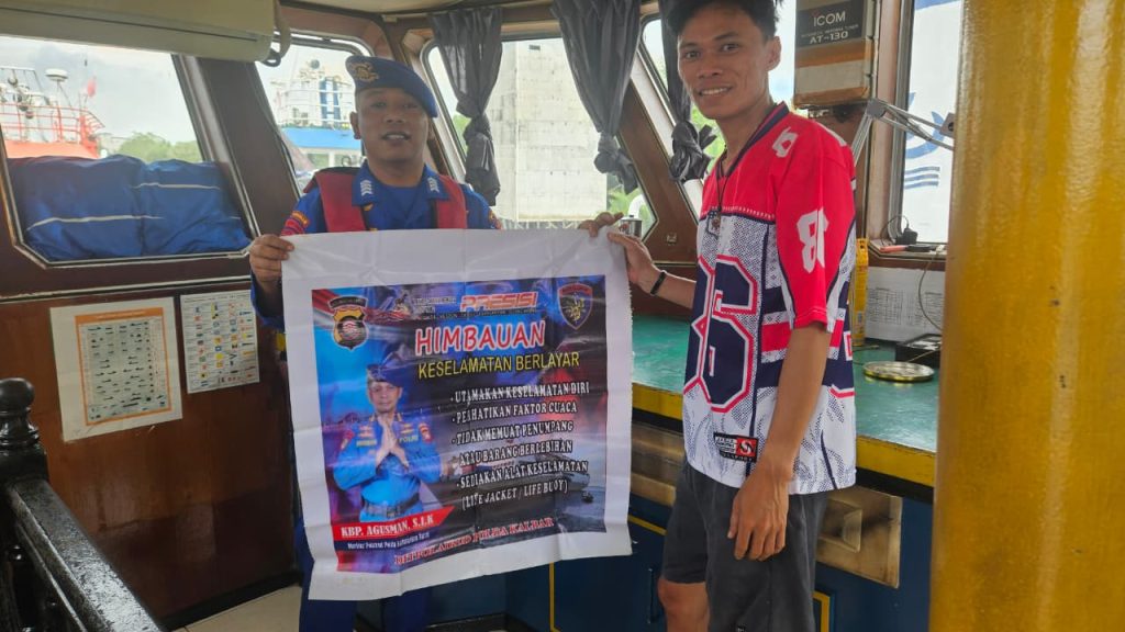 Anggota KP.VI-1010 memberikan himbauan keselamatan berlayar kepada Nahkoda Kapal yang sedang melintasi alur pelayaran teluk melano agar tetap menjaga keselamatan serta selalu menjaga kamtibmas