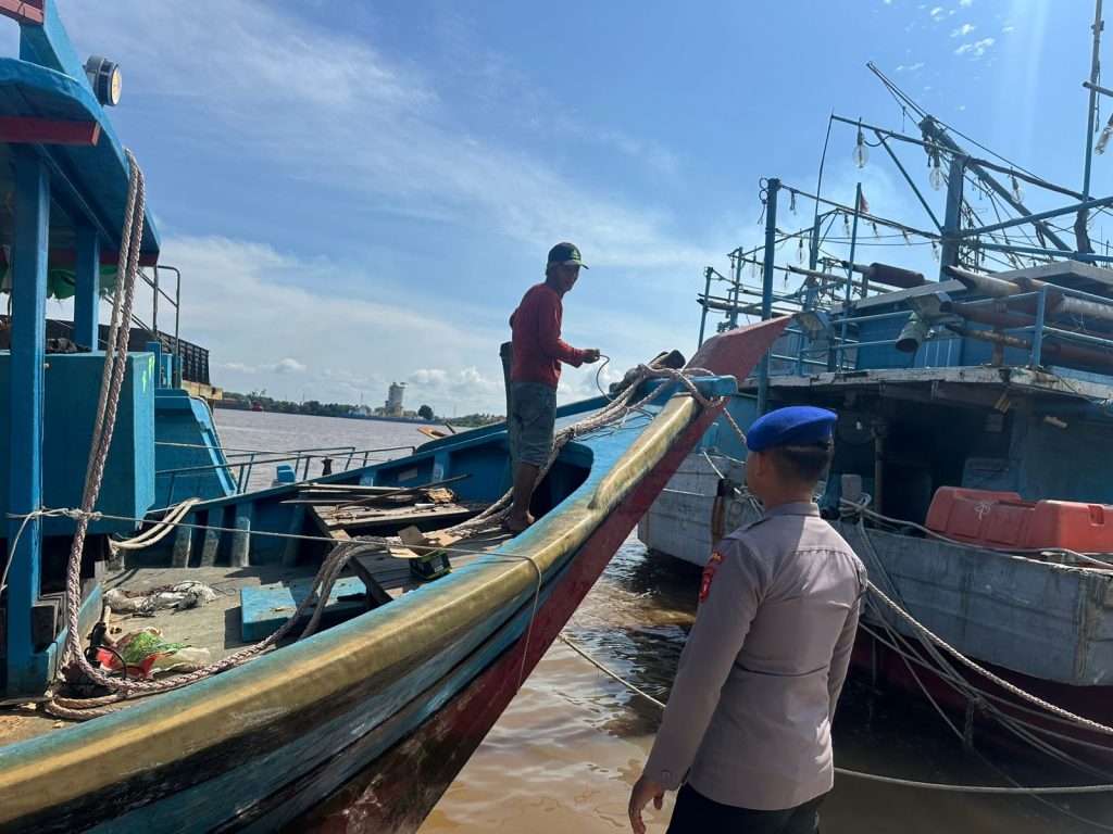 Anggota KP VI-10-18 TPI Sungai Rengas melaksanakan himbauan kepada Abk kapal untuk memastikan keselamatan dan kepatuhan terhadap protokol keselamatan kerja.