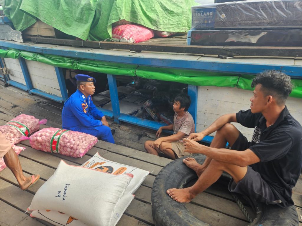 Anggota KP.VI-1010 memberikan himbauan keselamatan berlayar kepada abk kapal yang sedang melintasi alur pelayaran teluk melano agar tetap menjaga keselamatan serta selalu mejaga kamtibmas