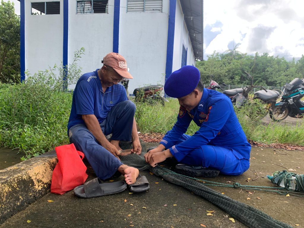 Melihat seorang nelayan yang tengah sibuk memperbaiki jaring ikan yang rusak di dermaga, personel KP. VI-10-11 Wilayah Paloh segera menghampiri dan menawarkan bantuan. Dengan telaten, petugas turut membantu merajut kembali bagian jaring yang putus agar alat tangkap tersebut dapat segera digunakan kembali untuk melaut.
