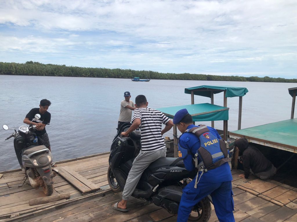Melihat kendala tersebut, Bripda Khairul secara proaktif membantu warga dengan mendorong dan mengangkat sepeda motor tersebut agar dapat naik ke dek kapal dengan aman. Kehadiran personel di lokasi tidak hanya mempercepat proses penyeberangan, tetapi juga memberikan rasa tenang bagi warga yang khawatir kendaraannya tergelincir.