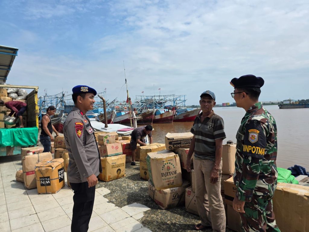 PATUHI PROTOKOL KESELAMATAN SAAT BEKERJA ANGGOTA KP VI-10-18 TPI SUNGAI RENGAS BERSAMA BABINPOTMAR PELABUHAN TPI SAMPAIKAN HIMBAUAN KEPADA BURUH KAPAL