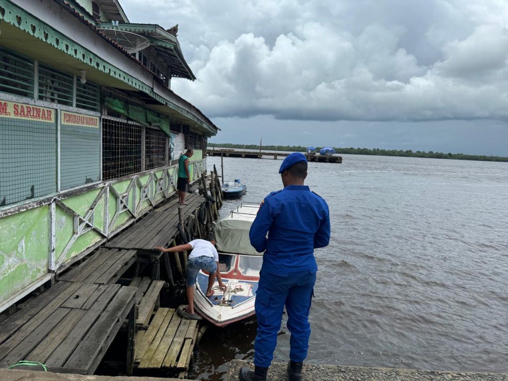 Personil KP. VI-10-08 Batu Ampar memberikan bantuan kepada Penumpang Speed Tambang di Pelabuhan Batu Ampar. Bantuan yang diberikan berupa membantu mengangkat barang-barang bawaan penumpang.